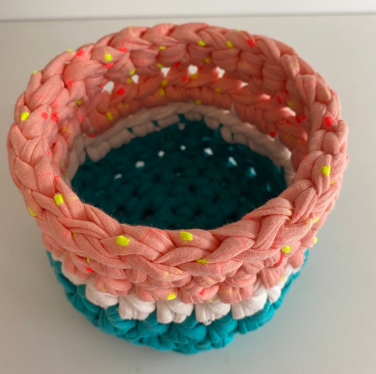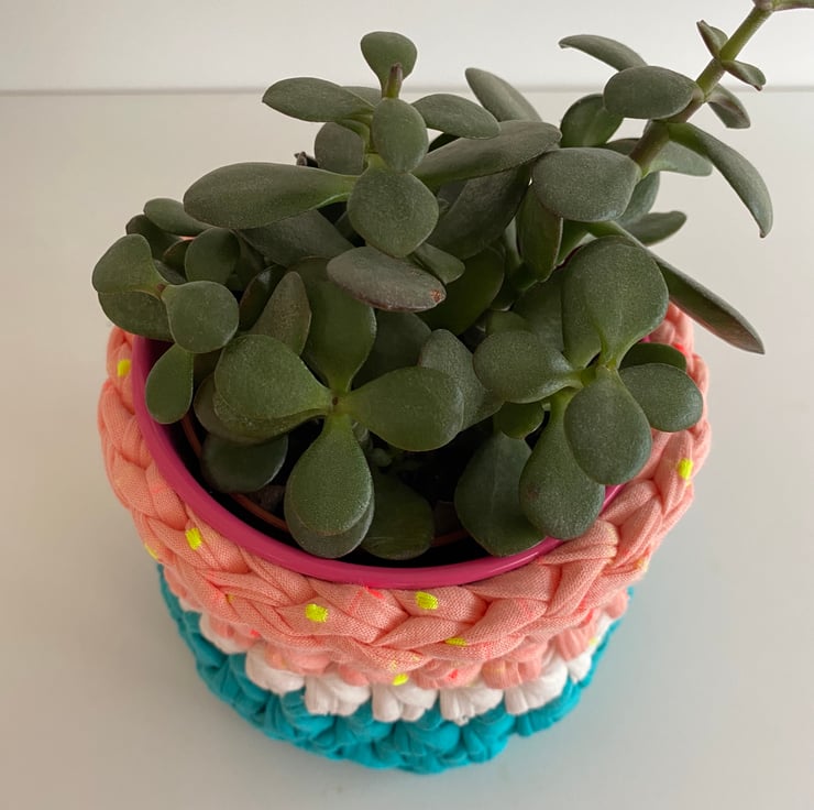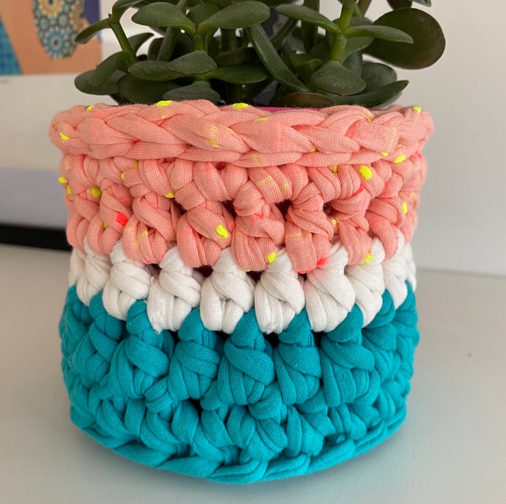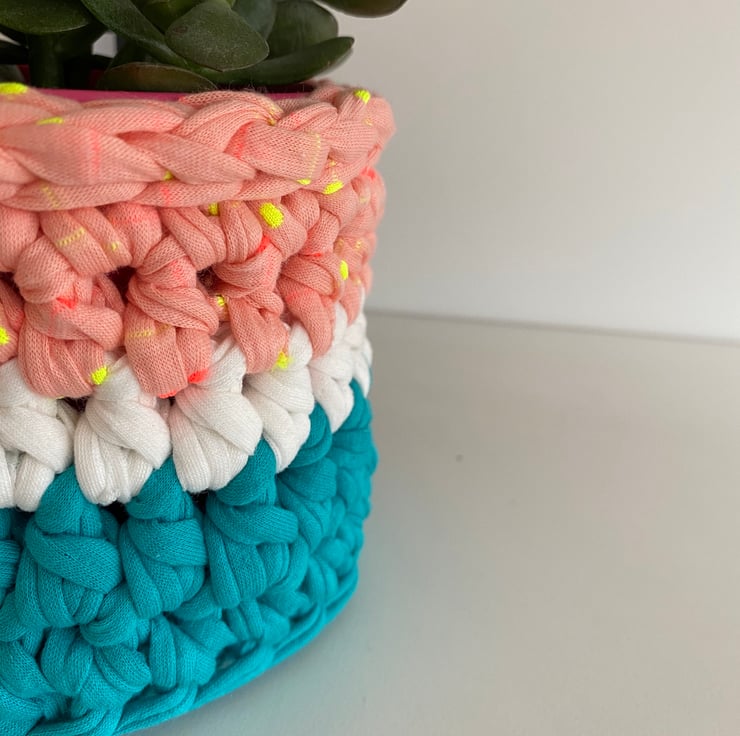 Made with sturdy upcycled textile yarn in pretty shades of turquoise, white and peachy pink with neon yellow and pink spots, the basket is approx 11cm diameter and 10cm tall. It is designed to accommodate a standard 10cm plant pot but will stretch slightly to fit different shapes.