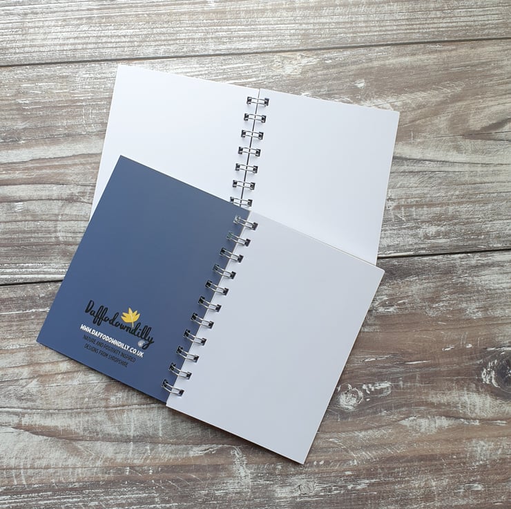 This Daisy filled notebook has a front sheet printed in the UK on a luxury 330gsm card and contains around 60 (A6) high quality blank paper sheets. The books are then hand spiral bound by me and backed with a thick greyboard back.
