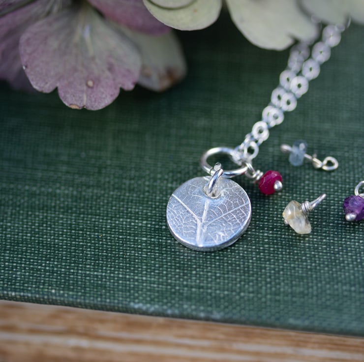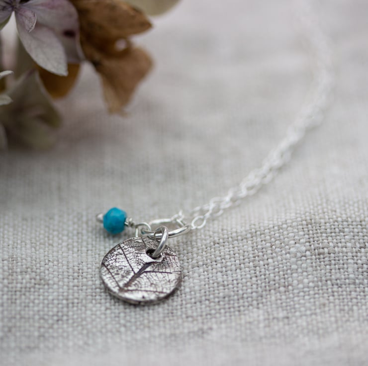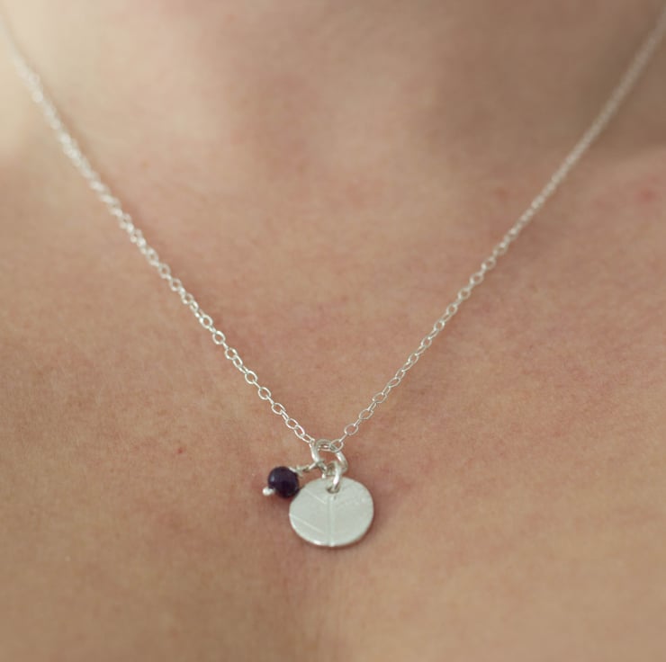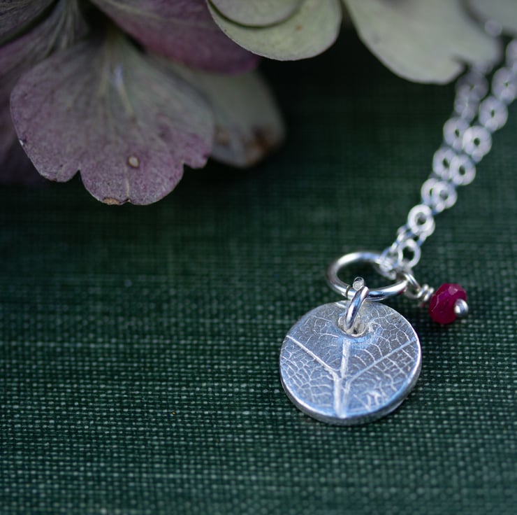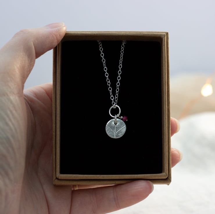 This lovely pendant is handmade from recycled silver. It's textured using a real skeleton leaf and a semi -precious bead charm is added to create a beautiful keepsake pendant.
