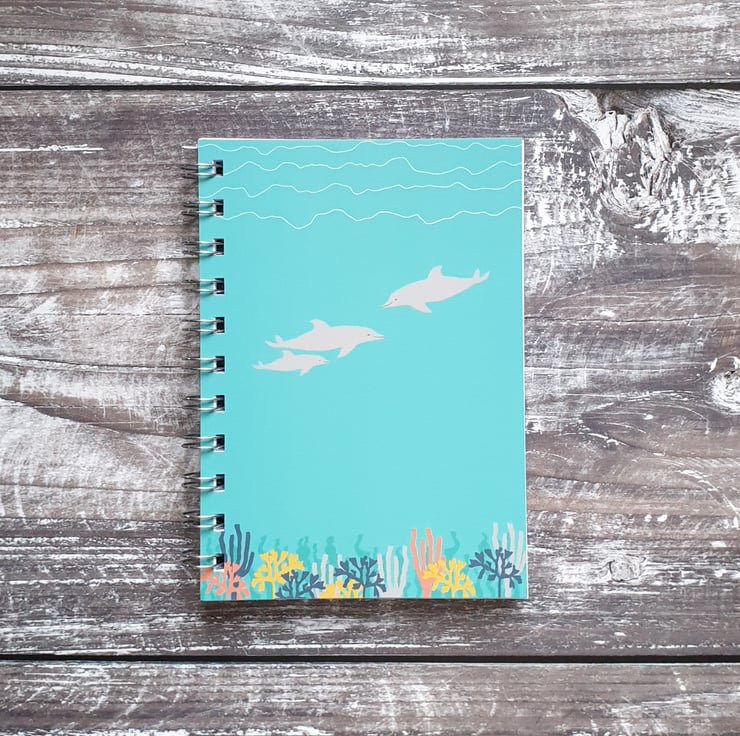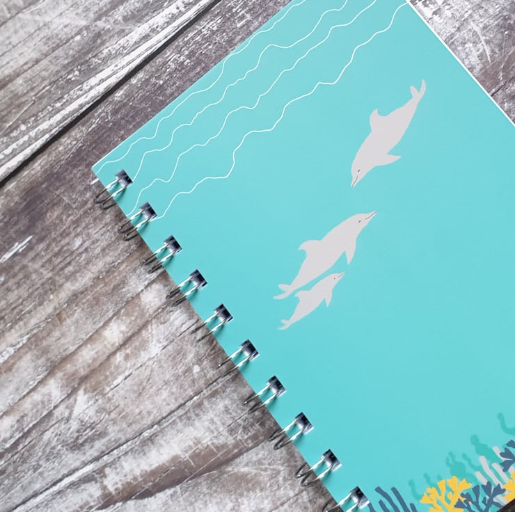 This Dolphin inspired notebook has a front sheet printed in the UK on a luxury 330gsm card and contains around 60 (A6) high quality blank paper sheets. The books are then hand spiral bound by me and backed with a thick greyboard back.