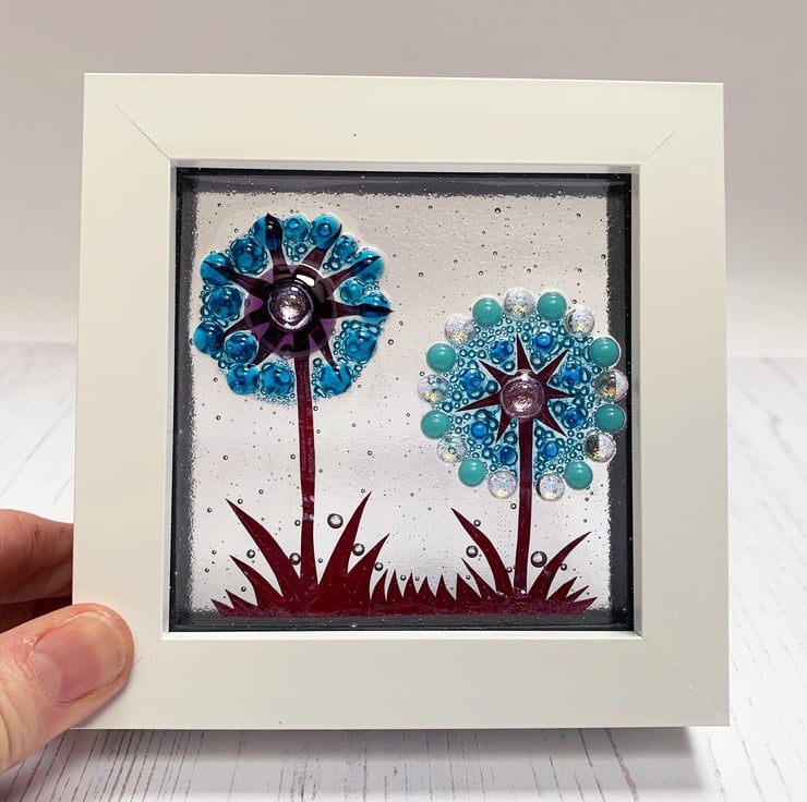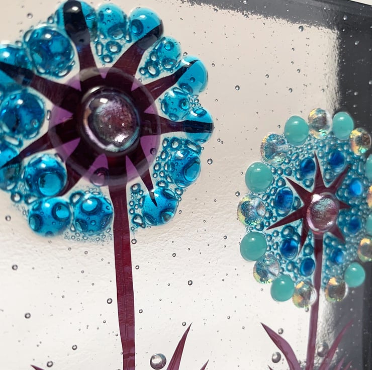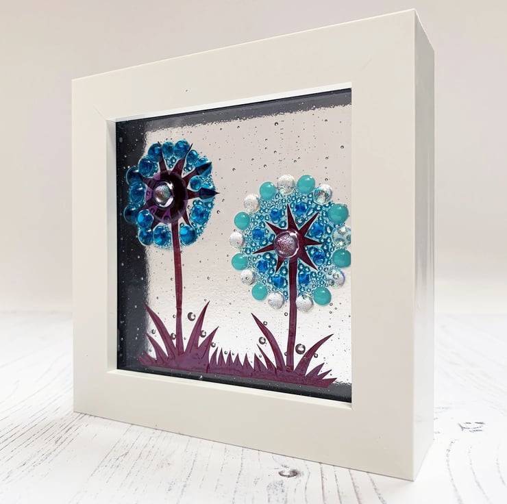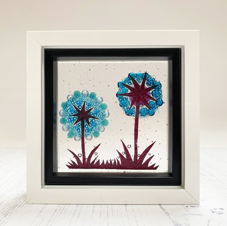 Fused glass freestanding piece in a chunky white plastic frame. Inspired by my love of the flowers that grow in my garden, this piece features 2 alliums in shades of turquoise, blue and purple. This would make a beautiful gift to put on a window sill to add some colours to the view.