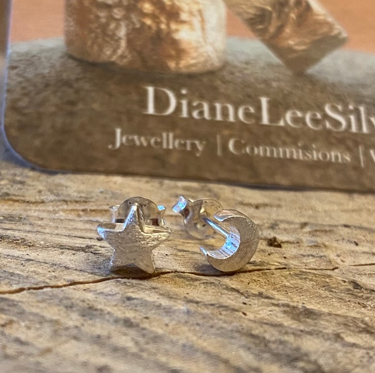 Chunky Moon as Star Stud Earrings, Solid sterling silver. Posts.