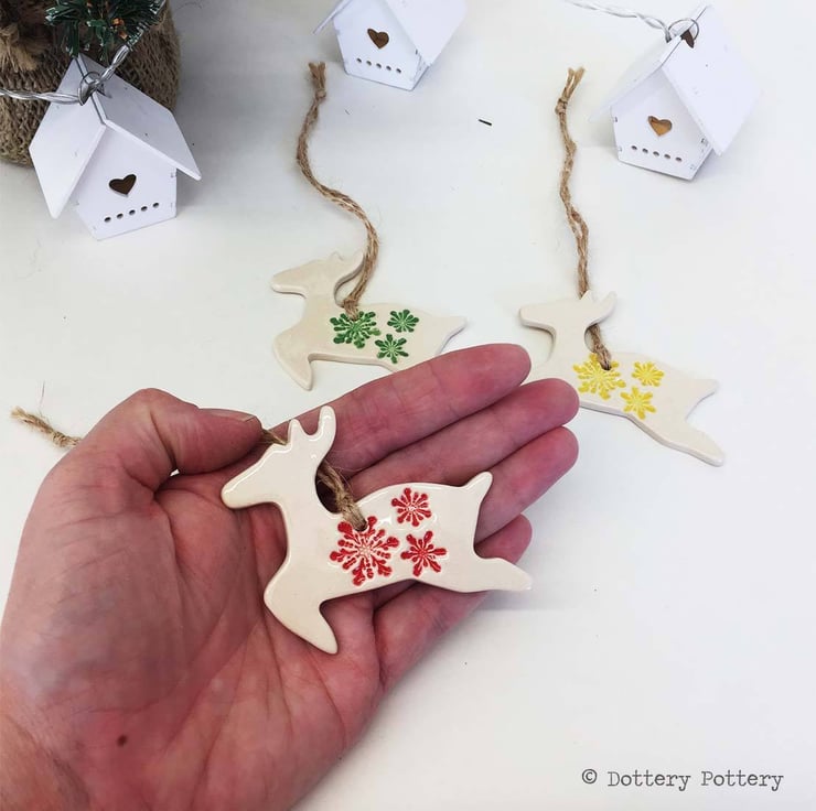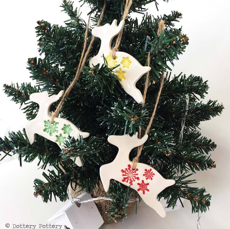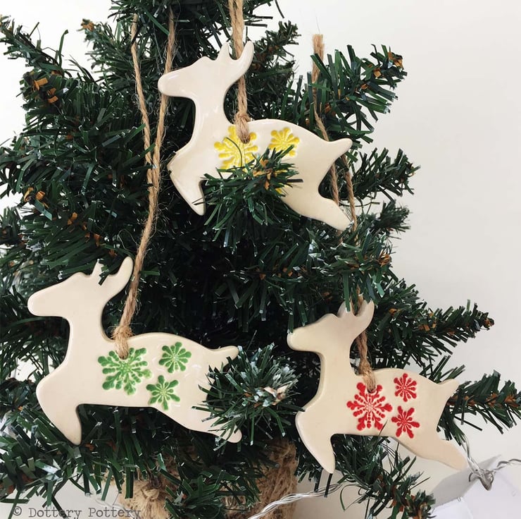 This set of three lightweight ceramic leaping deer decorations have an imprinted snowflake design and are finished in a glossy clear glaze..They are made from white earthenware clay and fired once, then glazed and fired again. They measure 7cm length and 6cm width and 3mm deep and hang from a brown string, Glazed on the front only