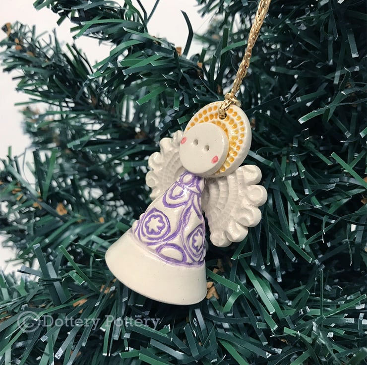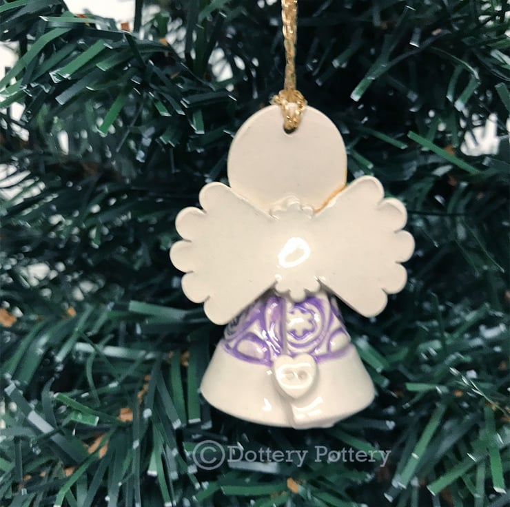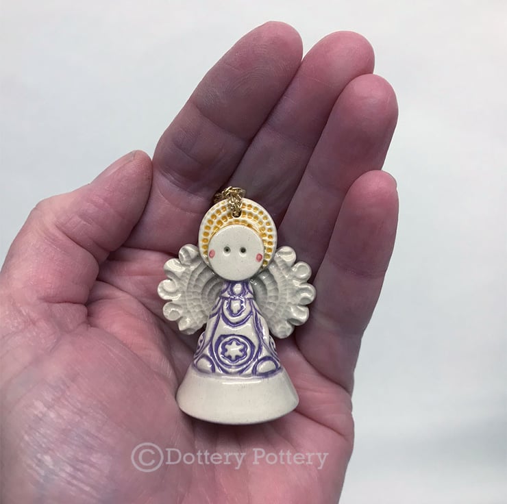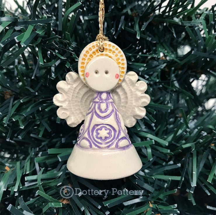 This tiny little angel is made from white earthenware clay. She has a little cream dress and a cute little button at the back. She can hang from the Christmas tree or be a free standing ornament. She measures 5cm high x 4cm wide (The last photo is just to show scale but you will be receiving a green angel not a blue one)