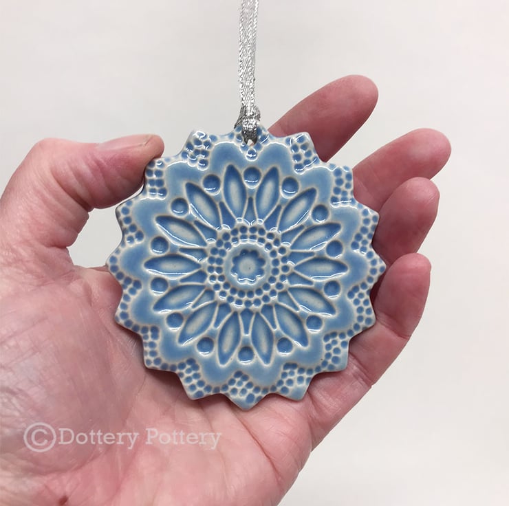 This listing is for a really pretty, fluted pottery Christmas decoration with a folk art design. It's made from white earthenware clay, imprinted with pattern and finished with a bright, glossy glaze. It has been fired twice, once to the bisque stage and then a second firing for the glaze. It measures 7.5 centimetres diameter x 5mm thick. It can also be hung outdoors.