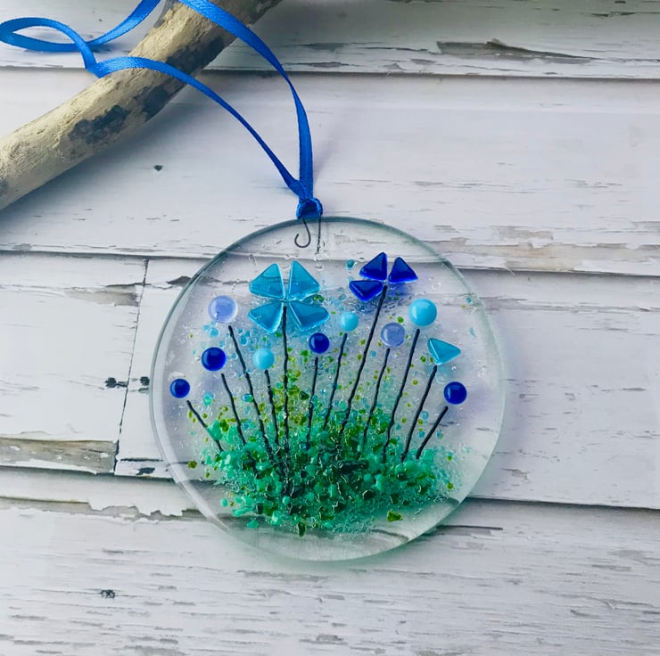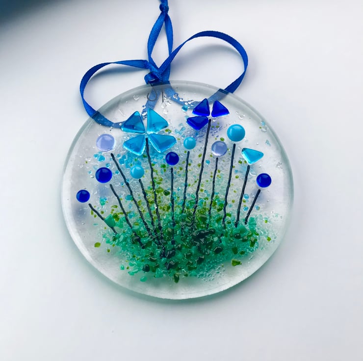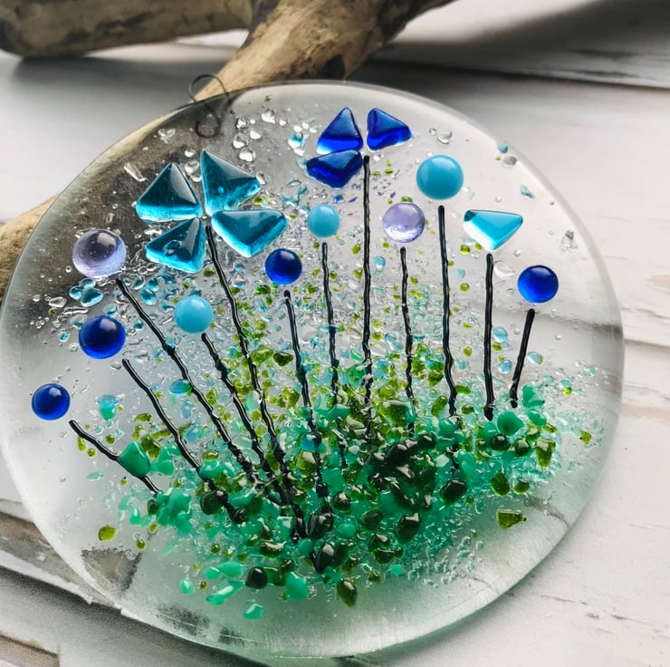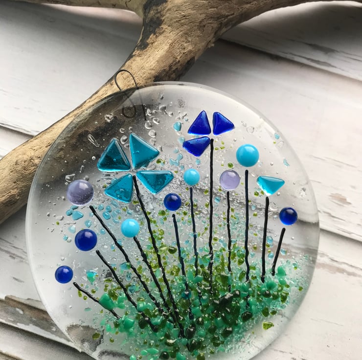 It is approximately 9 cm in width and height. It is made from two hand cut glass circles which are fully fused before a third layer of glass, forming the flower details, is tack fused on top. It would look nice in a window or on a white washed wall where the light can find it.