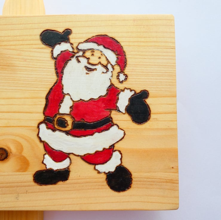 To make this sign I glued a number of pieces of wood together then cut a suitable size piece of wood from the glued pieces and sanded it by hand to a smooth finish. A template was applied to the wood and transferred using carbon paper. The sign was completed by using pyrography (the art of wood burning). Acrylic paint was then applied to the Father Christmas. The edges of the wood were lightly sanded to give it a slight round over effect. It was then coated in natural Shellac then finished with several coats of lacquer before being left to dry. The post was attached with two screws.
