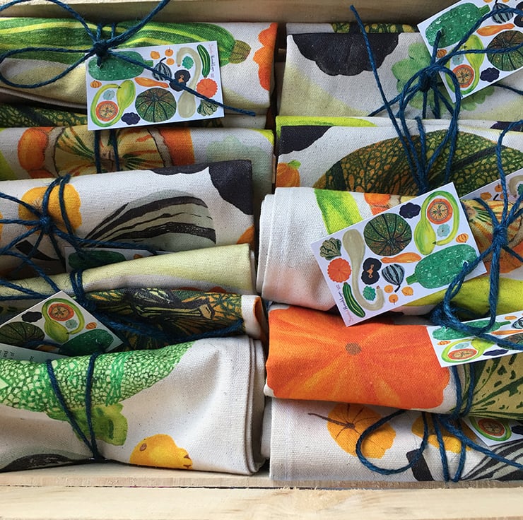 The Tea towels are tied in dark blue jute twine with a swing tag printed on recycled card with the product story on one side and a picture of the full design on the other side.