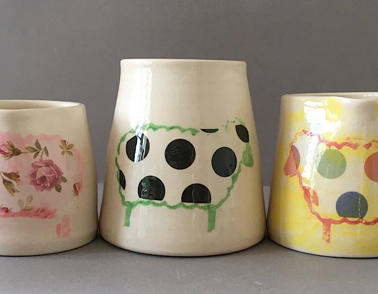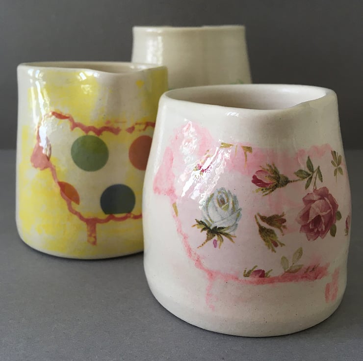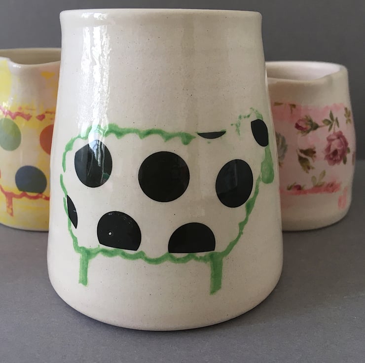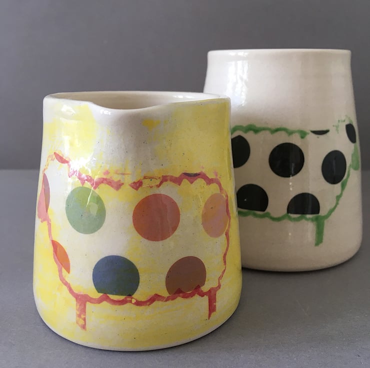 The medium jug has a wash of yellow and multicoloured spotted body: H:7cm D:6.5cm