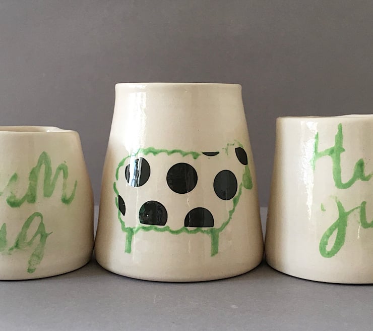 Cream/White earthenware ceramic pourer set, Hand thrown on my little pottery wheel. Dipped in a transparent clear glaze. The 3 pourers all feature a handmade and printed sheep design.