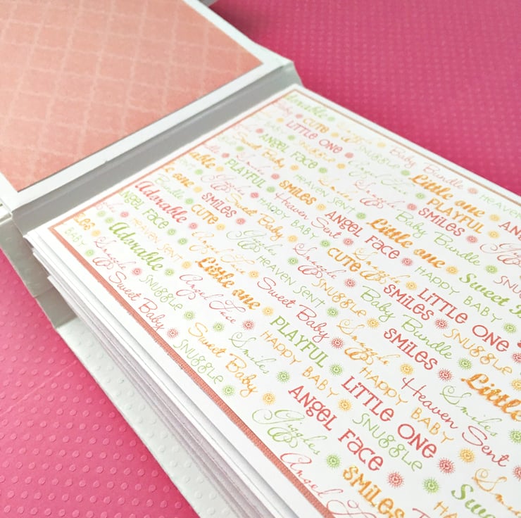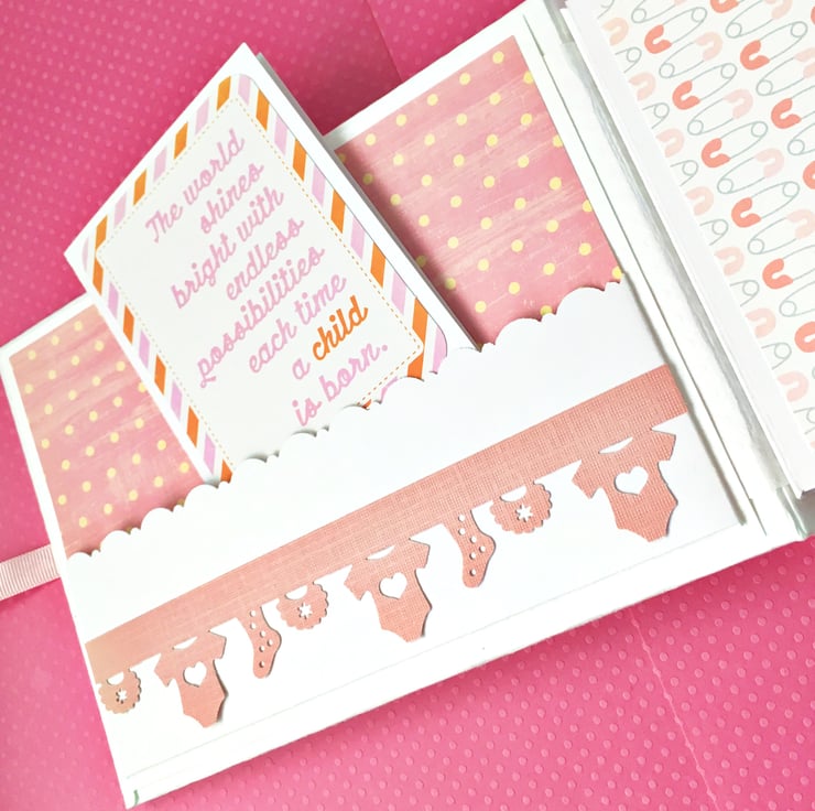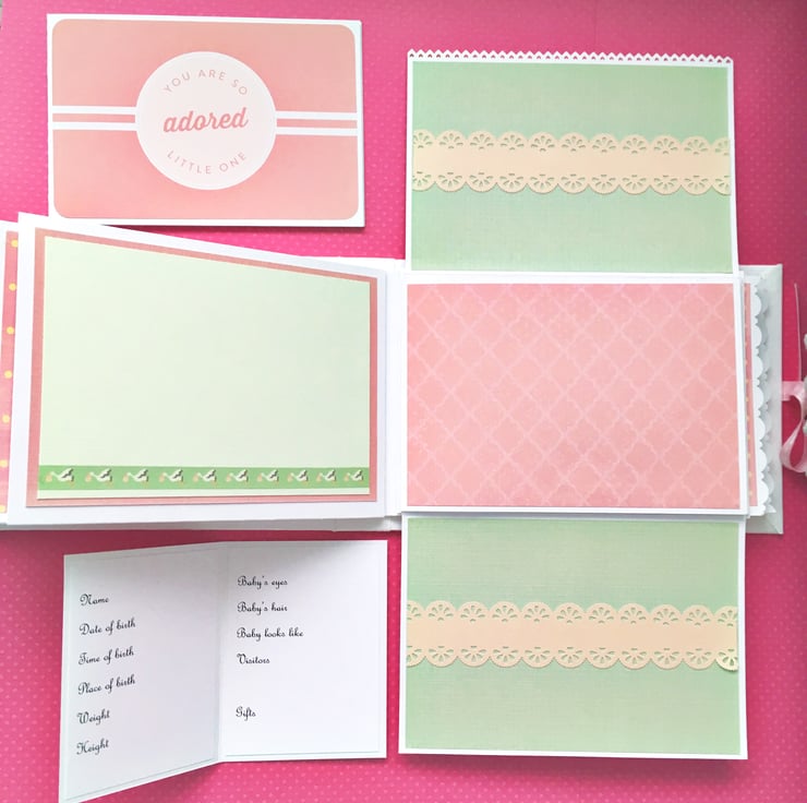 The album measures 7 and 3/4" x 5 and 1/2" (19.5 x 14 cm) and has 6 pages. Each page has an additional pull-out photo mat and the album has room for a minimum of 30 photos. The spine measures 1 and 1/2" and the album has a pink ribbon closure featuring tiny baby feet. The colour scheme is predominantly pastel pink, yellow and green and several pages, including the front and back cover feature encapsulated glitter.
