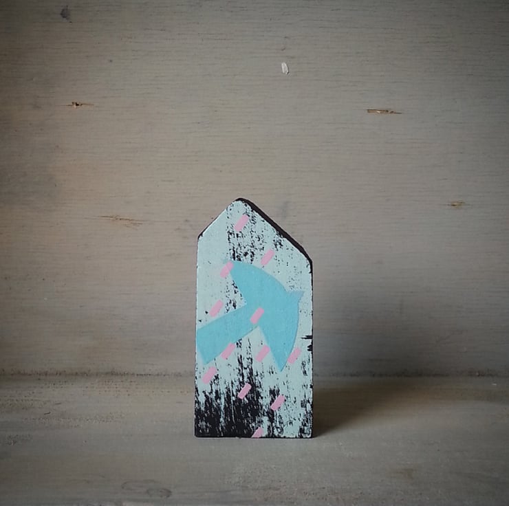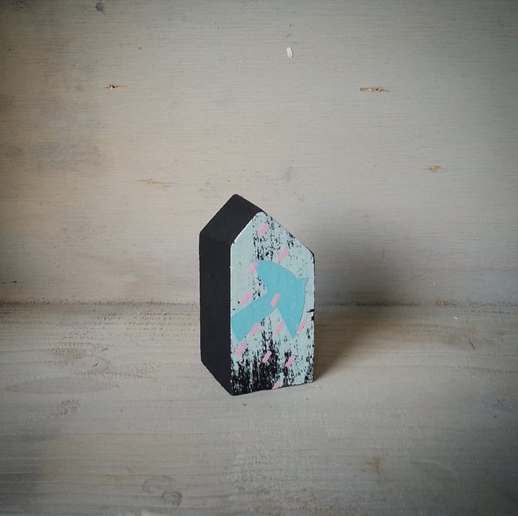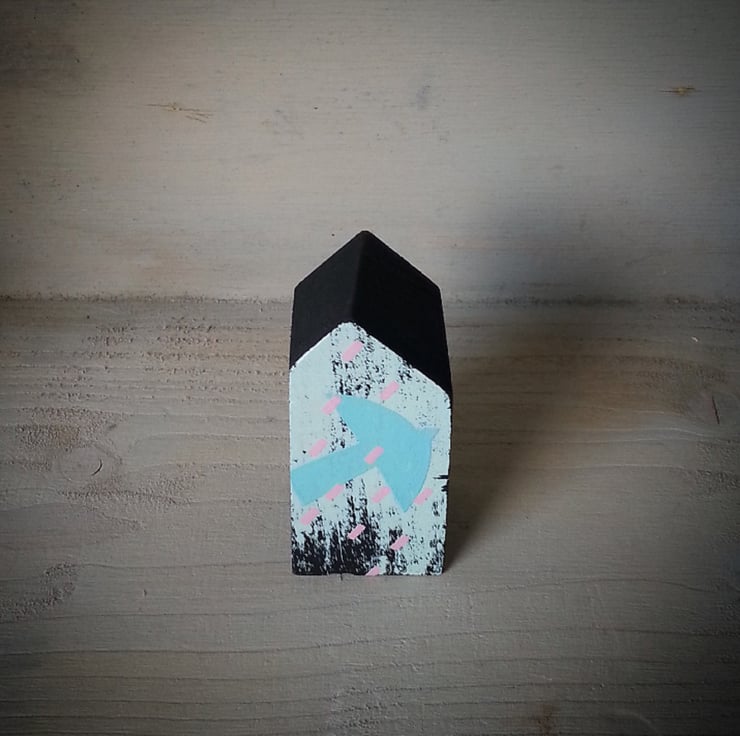 This one of a kind little wooden house is made from reclaimed wood, painted black, and screen-printed by hand in layers of pink and duck egg blue, with a turquoise bird. The back of the house is blank.