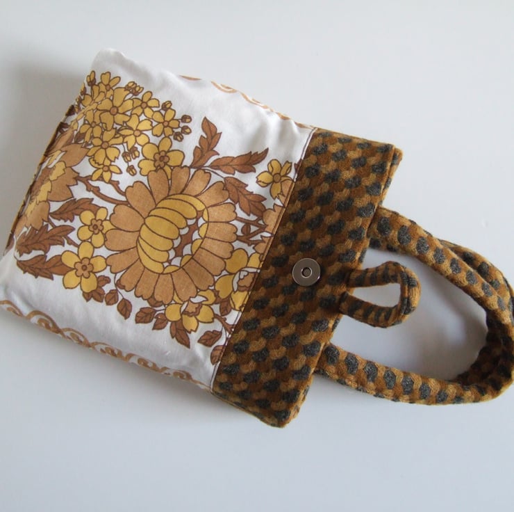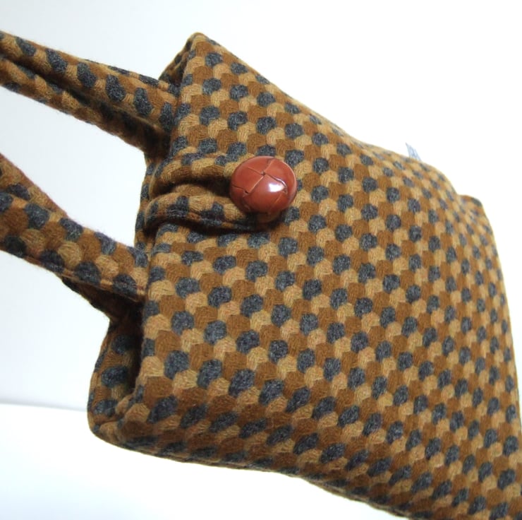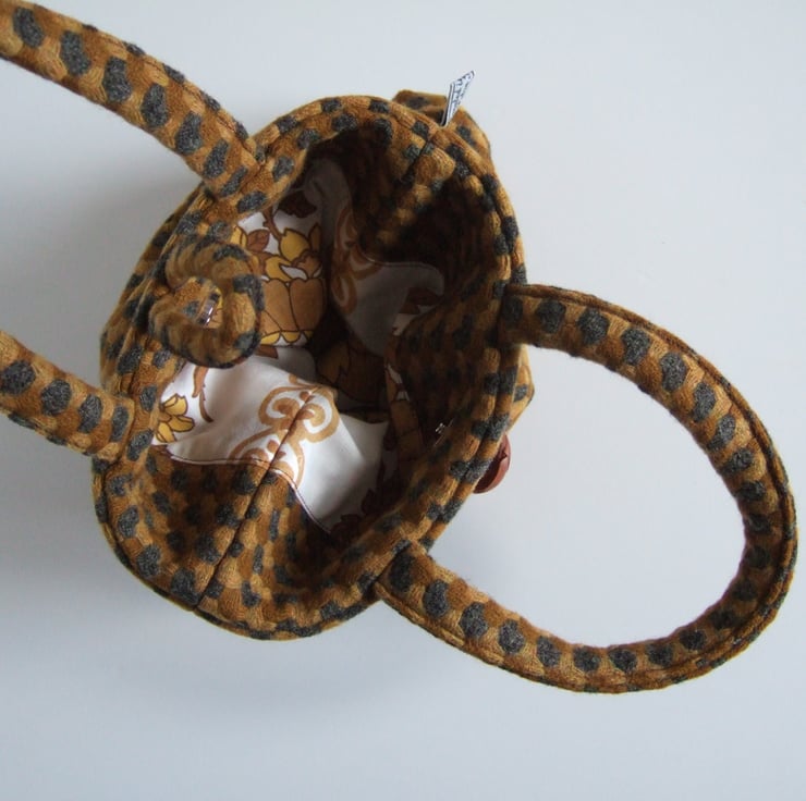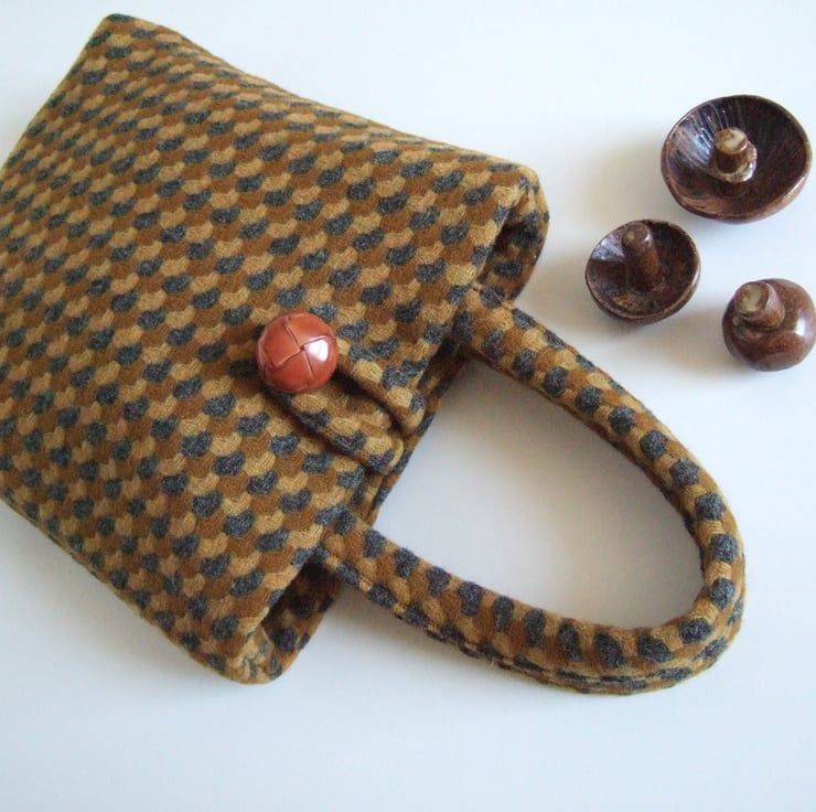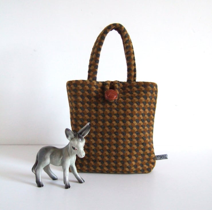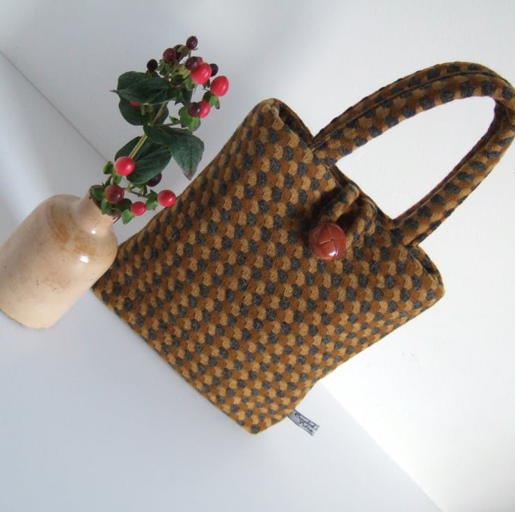 This sweet little bucket bag is made from an understated brown and mustard patterned wool. It has a leather-look button and loop fastening, as well as a magnetic clasp, and its two handles fit snuggly around your hands. This cute and dinky little bag is still large enough to hold your essentials for a winter walk; facemask, hand gel and phone. It would make a lovely present for a best friend, as a gift for a winter Birthday, or to keep for yourself to store precious souvenirs