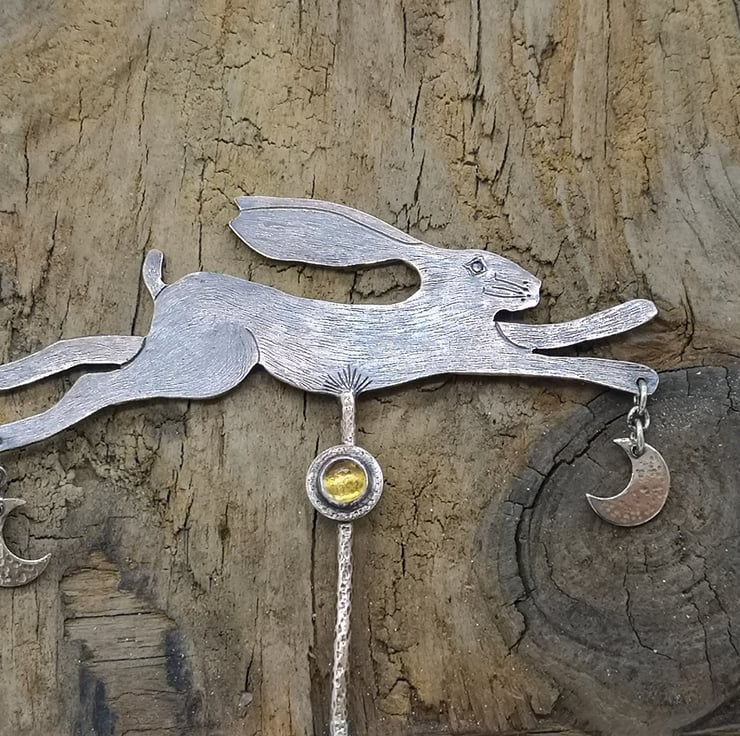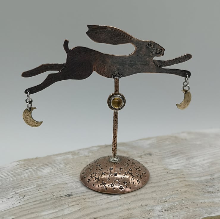 Made from copper sheet and wire with gilding metal for the moons. This little hare is hand pierced with my jewellers saw and carefully soldered onto a base I have made. Prior to soldering, detail has been added by hand engraving, metal stamping/hammering. Oxidised finish and set with a lovely citrine gemstone.