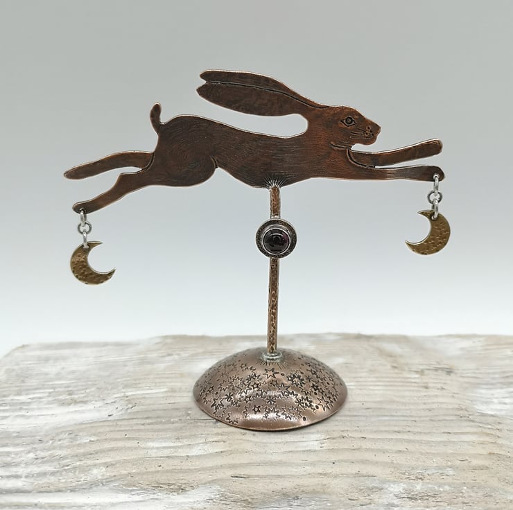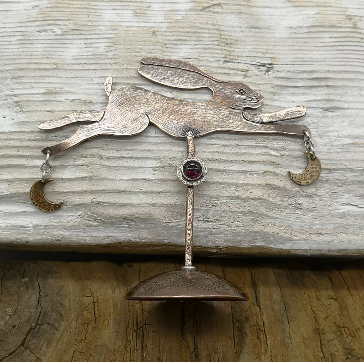 Made from copper sheet and wire with gilding metal for the moons. This little hare is hand pierced with my jewellers saw and carefully soldered onto a base I have made. Prior to soldering, detail has been added by hand engraving, metal stamping/hammering. Oxidised finish and set with a lovely garnet gemstone.