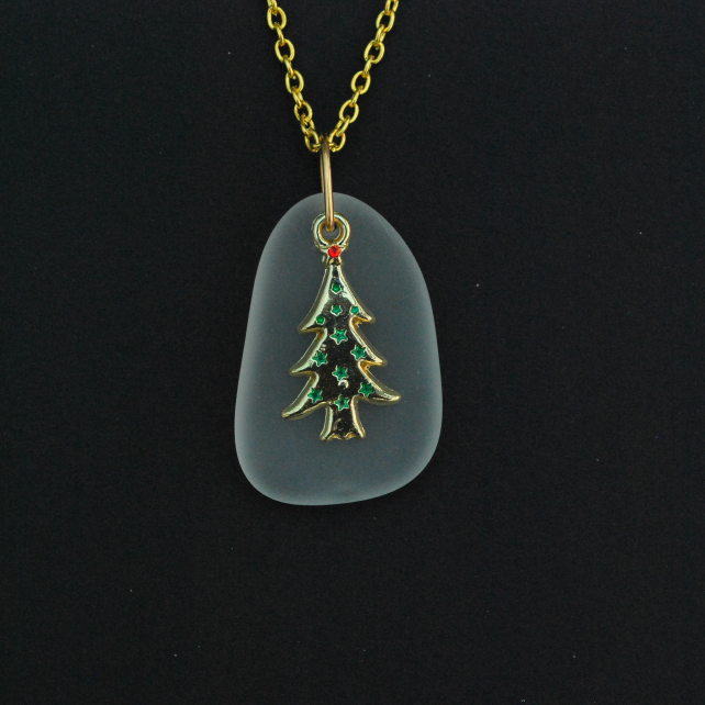 The snow in this attractive pendant is a piece of white beach glass which we have tumbled until it is finely frosted all over. It makes a beautiful backdrop for the little gold Christmas tree charm. A pendant like this looks great against a wide range of background colours including black, as can be seen in the photos.