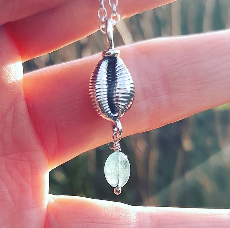 Sterling Silver Cowrie Shell or Groatie Buckie as they are known as in Orkney. A shell associated with luck. A lovely Aqua Blue Tourmaline. Length 20 mm approx. Supplied on a17 inch oval belcher chain. Please specify at check out if another length required