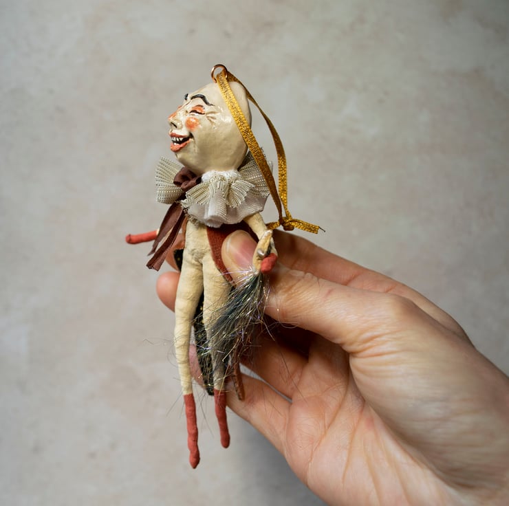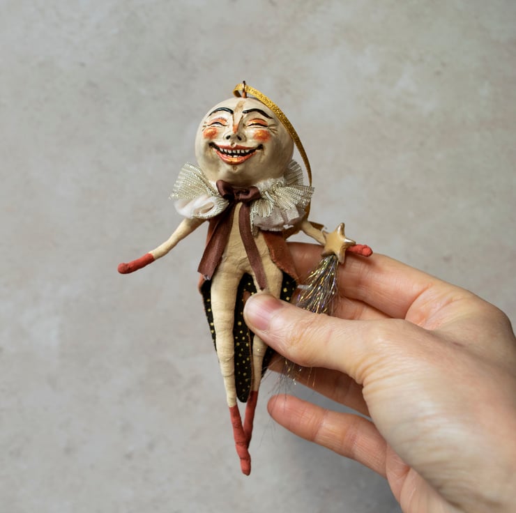 I have made him entirely from scratch from ceramic bisque, wire and cotton. He is wearing a lovely velvet jacket that has a brown and gold spotted reverse pattern. He has a velvet and metallic ruffle collar and is holding a sparkling shooting star that he has caught just for you!