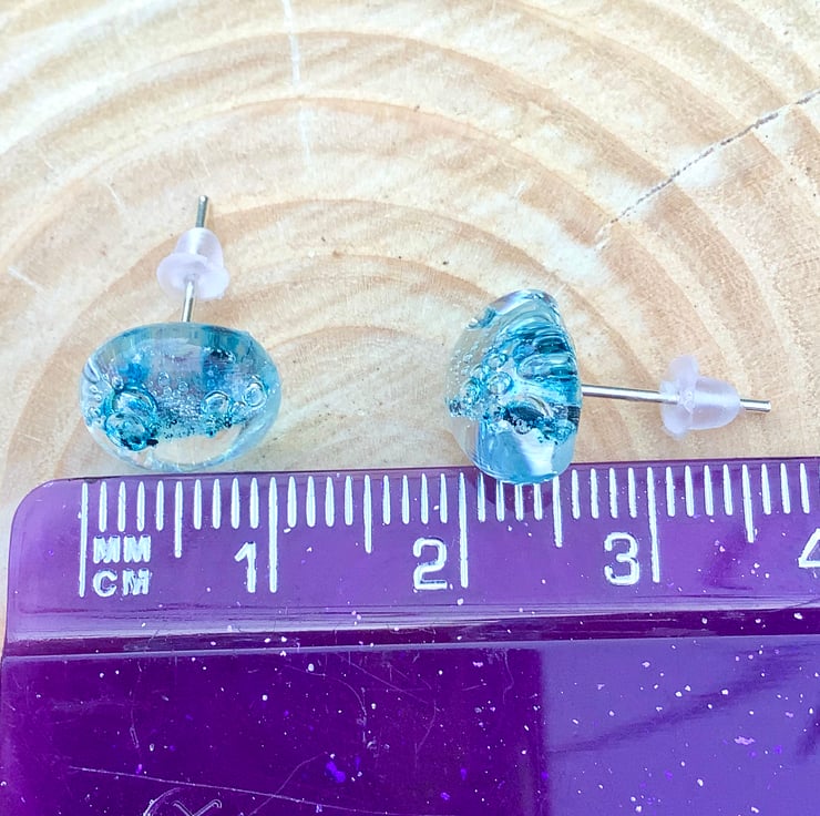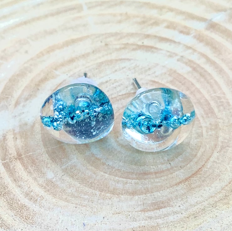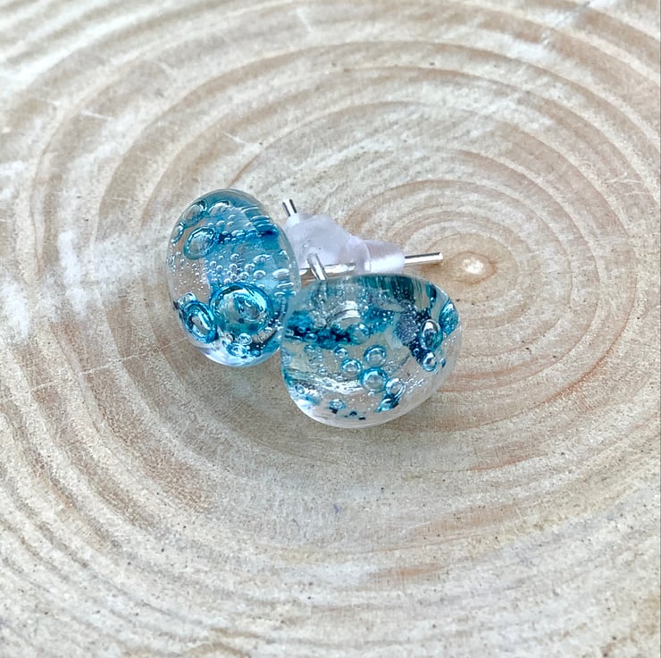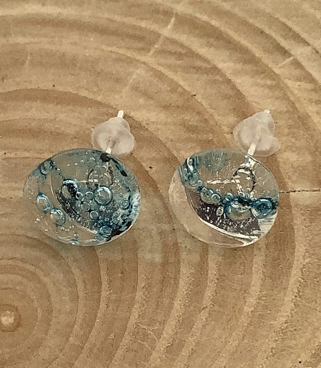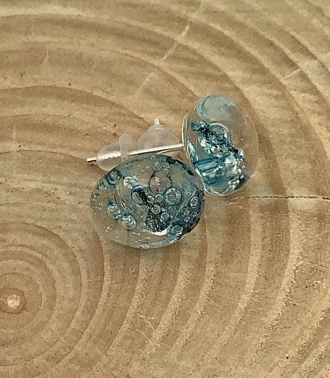 Fused glass stud earrings. I have fused two pieces of glass together with copper oxide in between the glass to create the bubbles. The earrings are fused in a kiln.