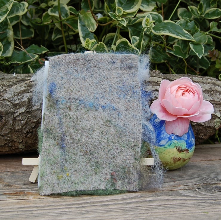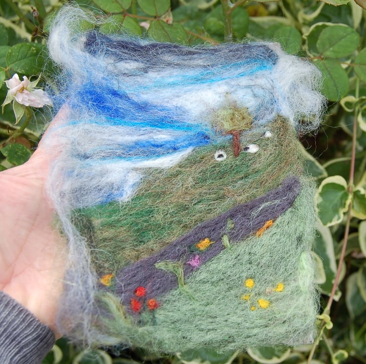 Needle felted with unspun wool onto a piece of pure wool reclaimed blanket.