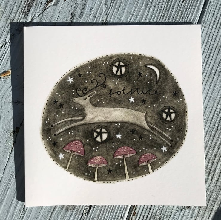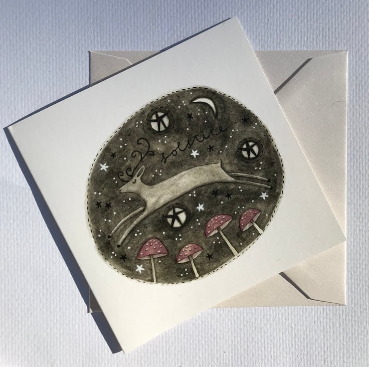 A 125mm square card supplied with ivory pearlescent envelope and taken from an original illustration by Three Acorns.