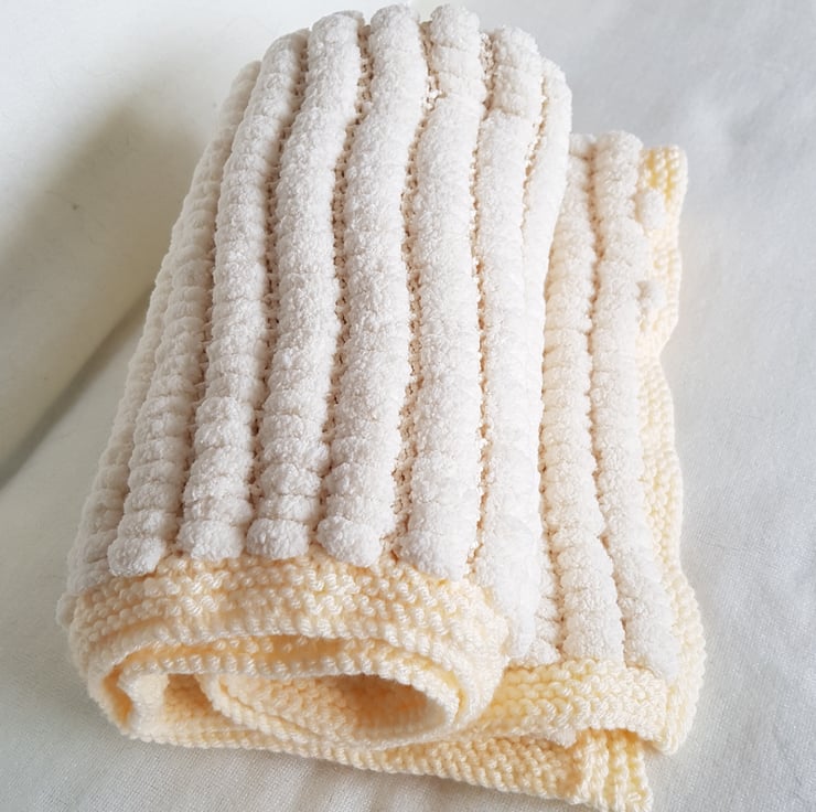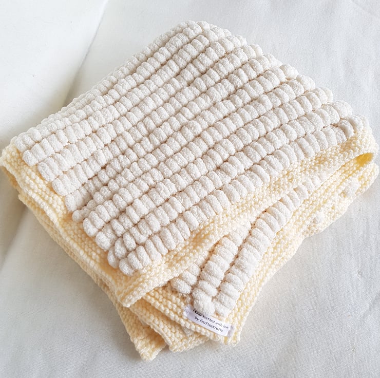 This lovely snuggly blanket is hand-knitted in this soft beautiful yarn, it is 100% Polyester and machine washable at 30'c