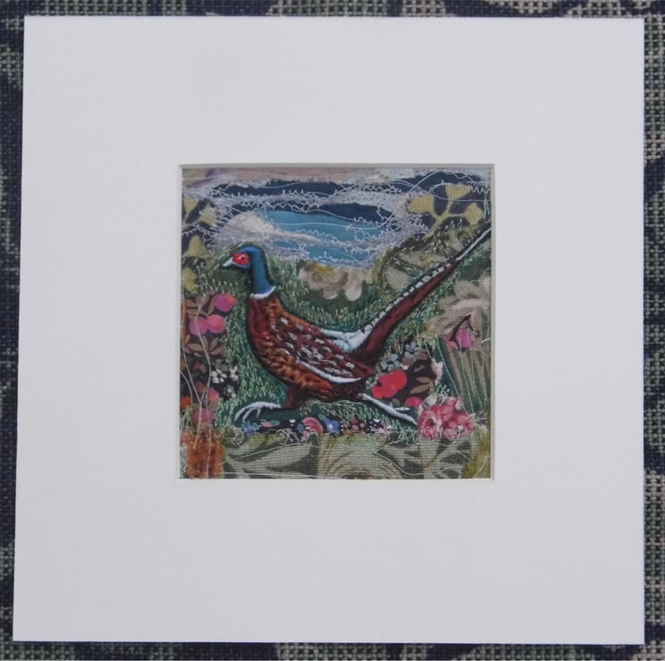 A machine embroidery of the distinctive game bird - The Pheasant. On a collage background of old cotton scraps with free motion stitched detail. Mounted with acid free off-white mount card.