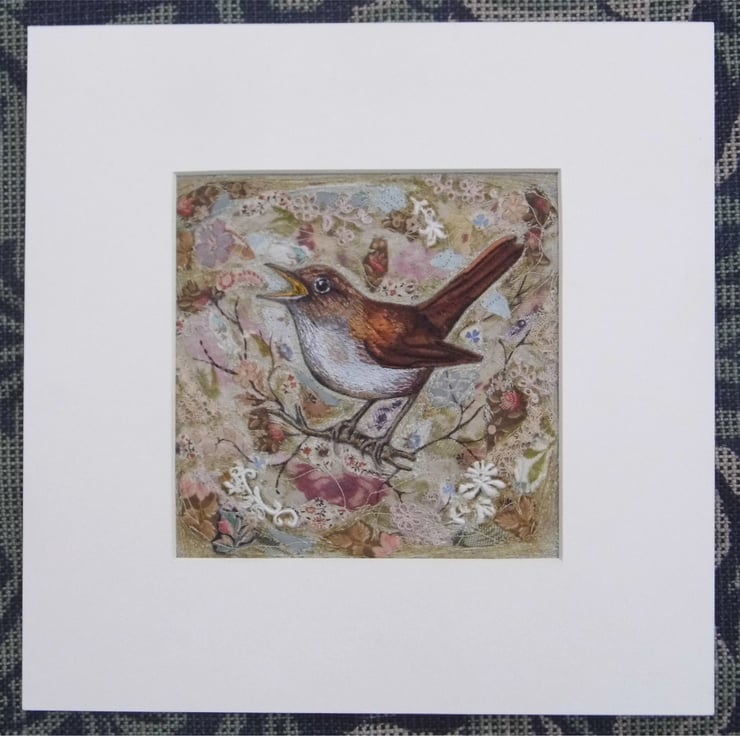 Machine embroidery collage of the rare Nightingale. With a decorative fabric collage background. Mounted in acid-free off white mount card.
