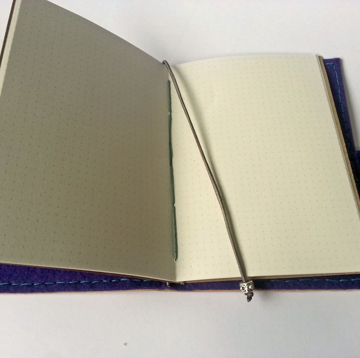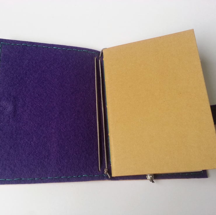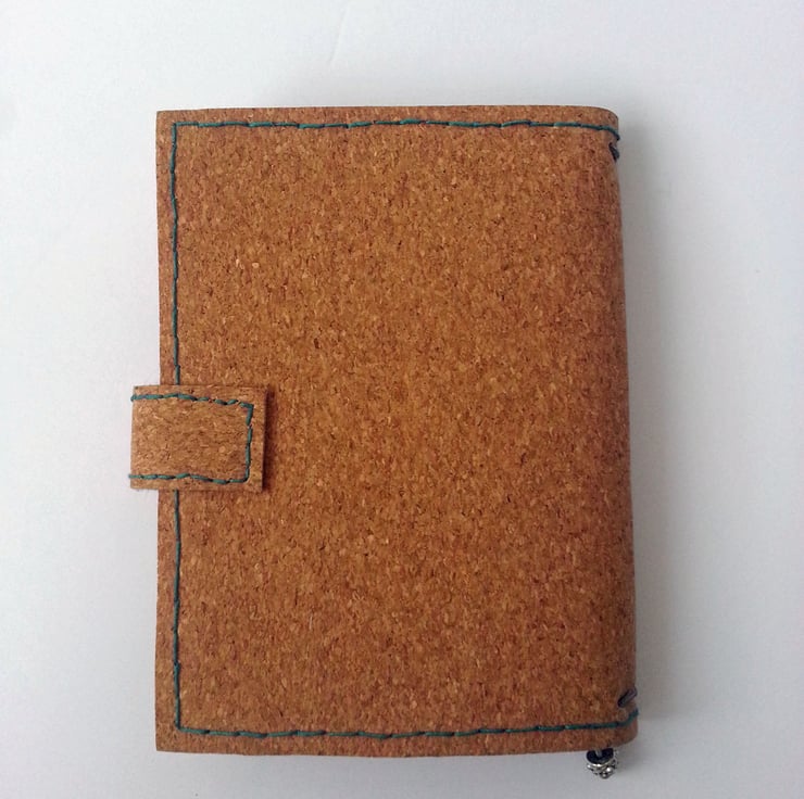 - There is decorative hand stitching in turquoise linen thread, round the outside of each case and on the closing tab of the notebook cover.