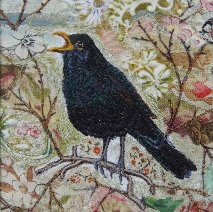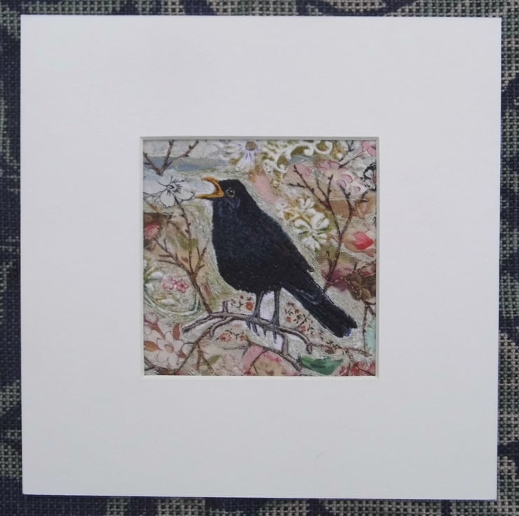 A machine embroidery of the distinctive Blackbird in song. On a decorative collage background with added lace and stitched detail. Mounted with acid free off-white mount card.
