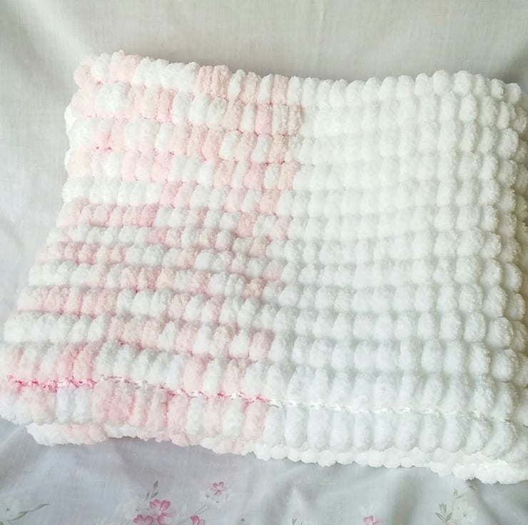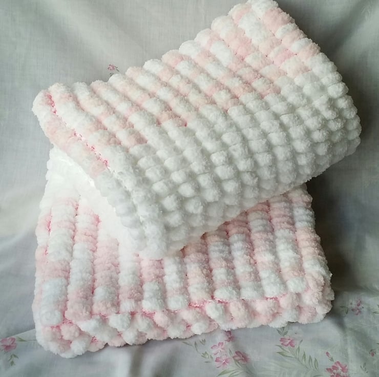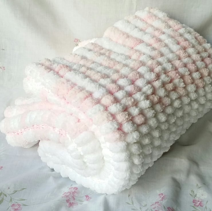 This lovely snuggly blanket is hand-knitted in this soft beautiful yarn, it is 100% Polyester and machine washable at 30'c