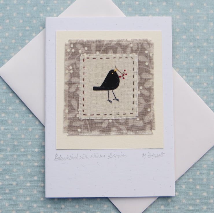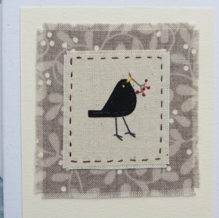 This is a small handmade greeting card featuring a miniature hand-stitched applique blackbird with intricate embroidered details backed with a pretty mistletoe cotton print. It is entitled 'Blackbird with Winter Berries' - suitable for Christmas, or winter birthday greetings.