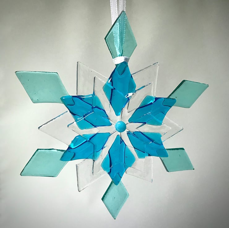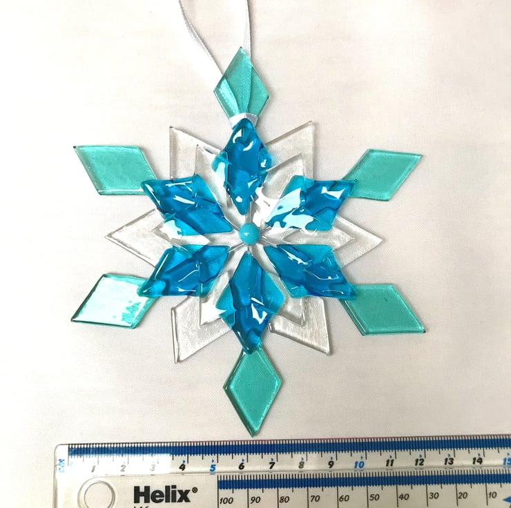 This lovely glass snowflake is constructed from 25 hand cut pieces of glass, carefully arranged and then tac fused in a specialist kiln at 740 degrees Celsius. It is hung on a white ribbon ready to hang on your tree, in your window or wherever you wish to show it off. It comes in a sleek gift box for storage.