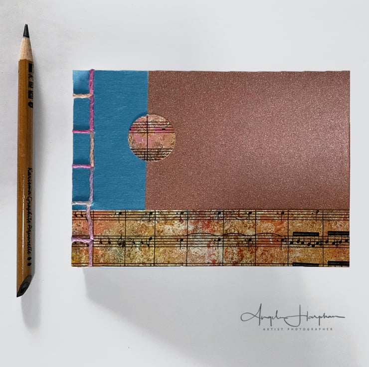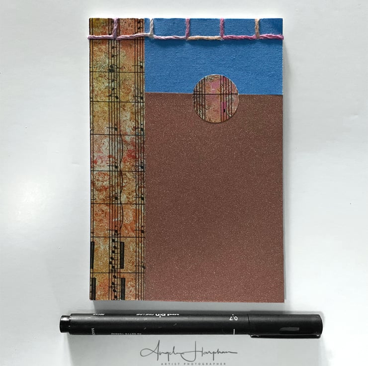 One in a series of hand made sketchbooks notebooks with Japanese style stitching in rainbow cotton thread, with paper inside made partly from recycled coffee cups. The front cover has book cloth linen, the sandy colour has a sheen to it, and sheet music that I mono printed. It is signed with my chop at the back.