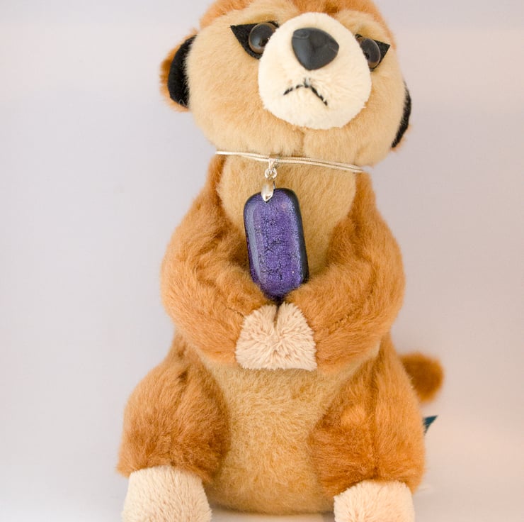 The rectangle of purple sparkle is strung from a 20-inch chain. You can choose from silver-plated or sterling silver chains at checkout.