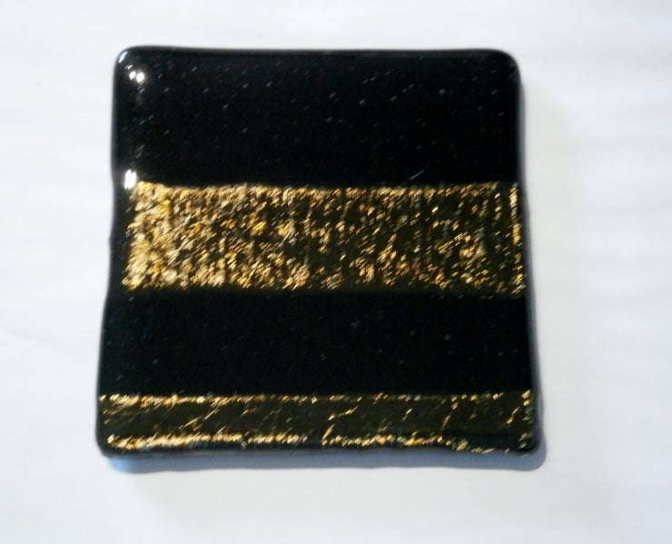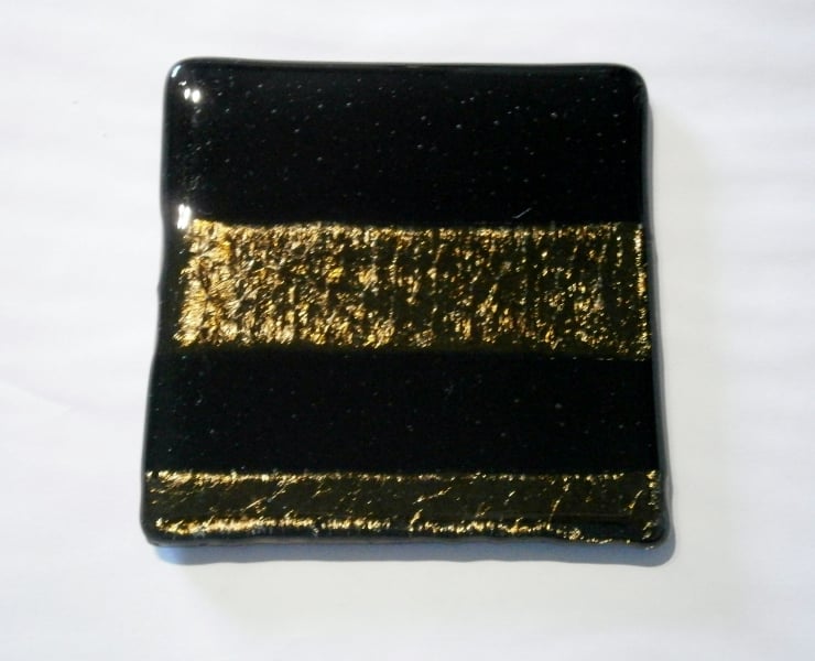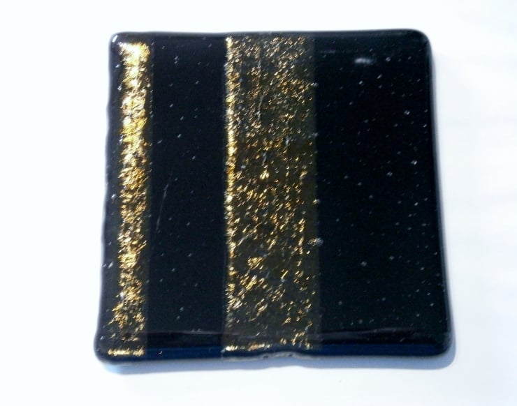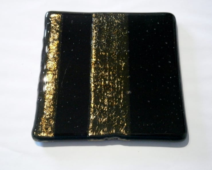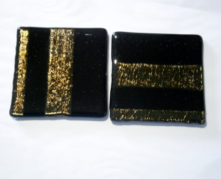 Add a touch of luxury to your home with these stunning fused glass coasters! Crafted with black glass and gold iridised glass, they exude elegance and sophistication. Each coaster measures approximately 9 sq cm and comes equipped with protective bumpers to prevent scratching. Note that the iridised glass photography doesn't do justice - they're even more breathtaking in person!