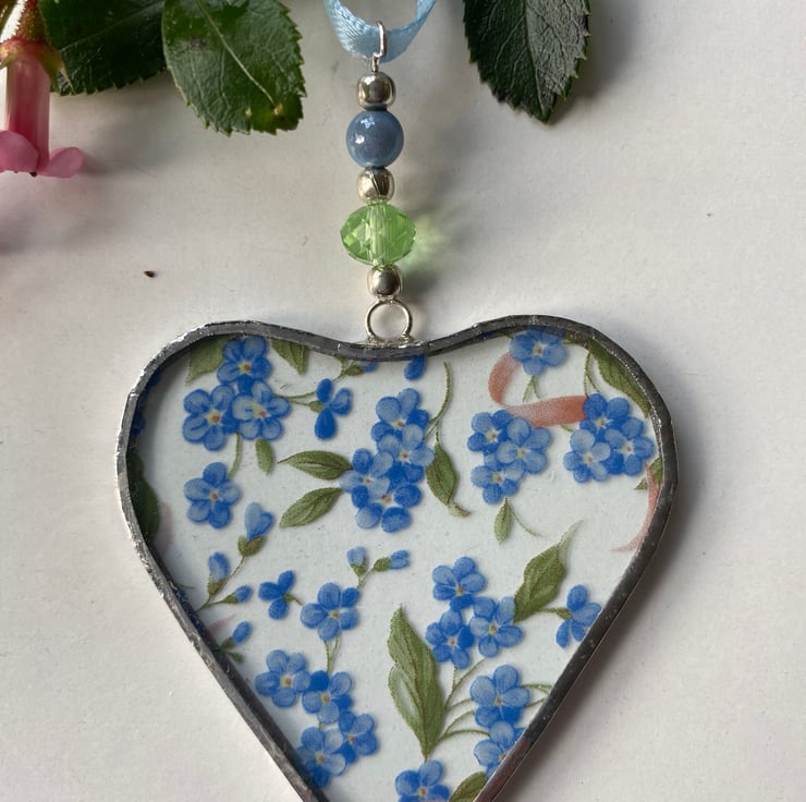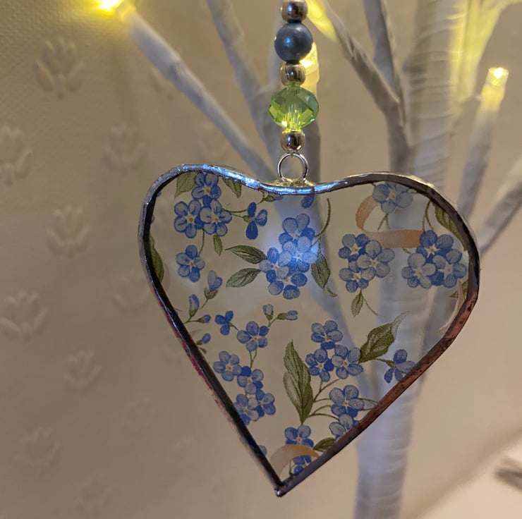 A beautiful stained glass heart made using the Tiffany (copper foiled) method of stained glass. The glass used is a beautiful clear glass with tiny forget me not flowers