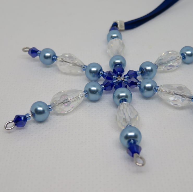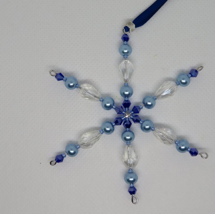 Cool shades of light blue and sapphire blue are set off by sparkling clear teardrop crystals in this pretty snowflake decoration. Glass pearls, bicones and seed beads are hand beaded onto a sturdy wire frame, with a blue ribbon hanging loop. Great on your Christmas tree or wherever you choose to hang it.