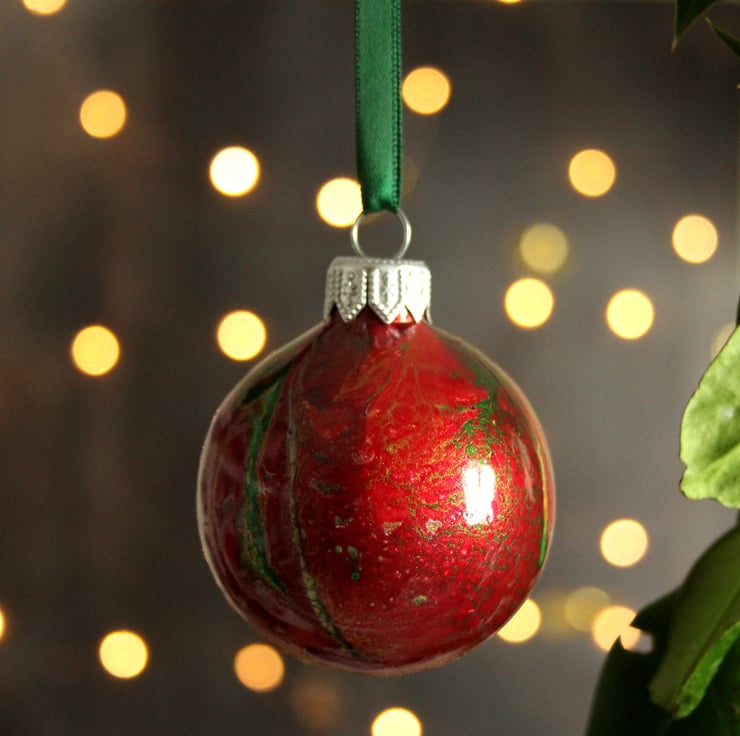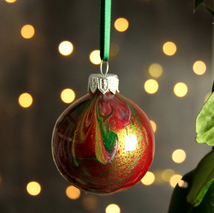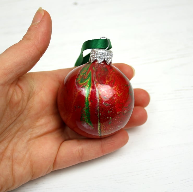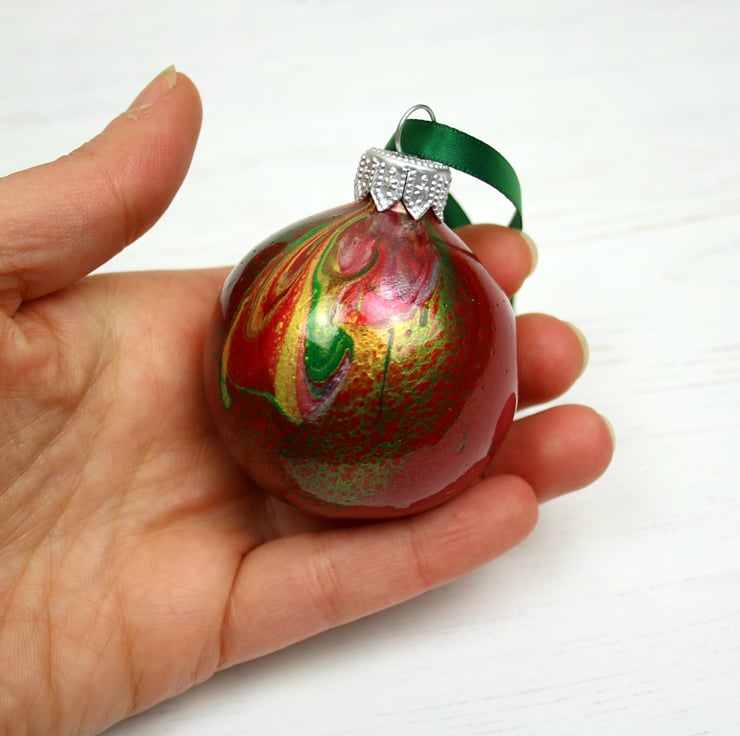 Deep metallic red, green and gold flows over the ceramic bauble. 5cm across and approx 6cm including the metal hanger. Hung with an approximately 6.5cm length of green 7mm satin ribbon.