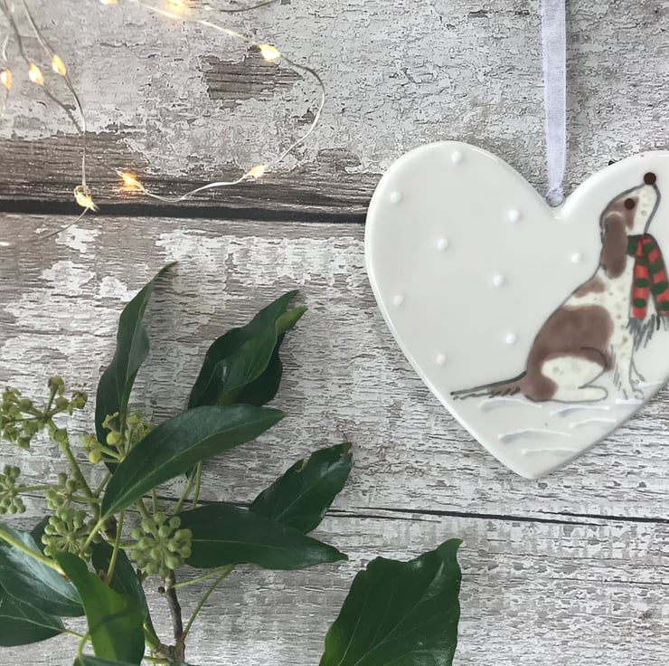 A beautiful hand painted Brown and White Spaniel type dog or Cockapoo dressed in his festive scarf has already become a popular design for the Christmas season.