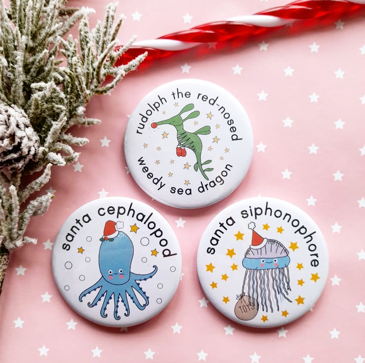 A set of three festive sea creature badges. Cephalopod, sophonophore and weedy sea dragon.