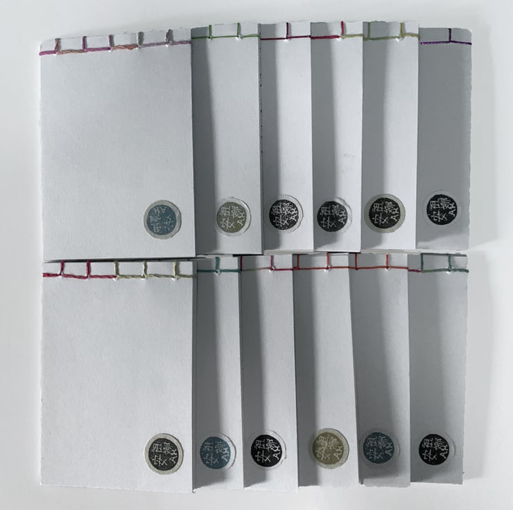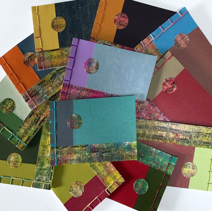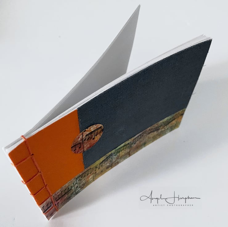 One in a series of 12 hand made sketchbooks notebooks with Japanese style stitching in cotton thread. The paper inside is made partly from recycled coffee cups. The front cover has book cloth linen, and sheet music that I mono printed. It is signed with my chop at the back.