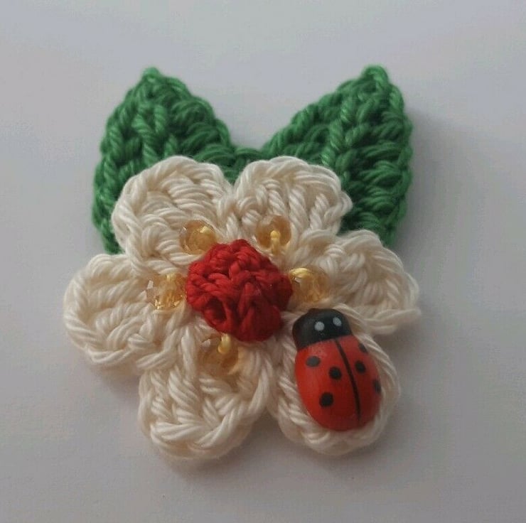 Cotton Wool Crochet Flowers with leaves there sewn to the flower, a lovely applique which can be used as a brooch as well (no pin attached)
