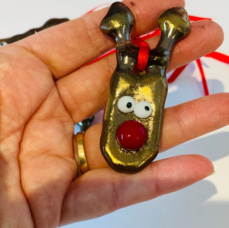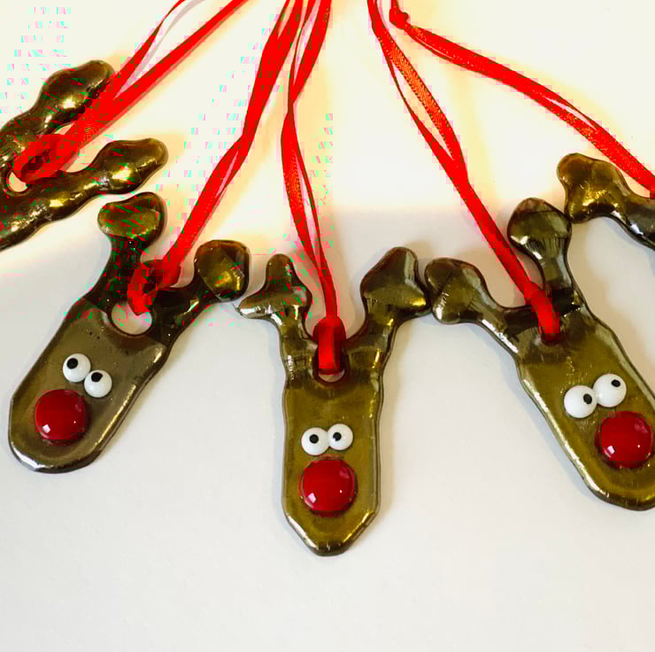 Fused glass luminescent sparkly reindeer heads . Textural and contoured. Hund with red ribbon