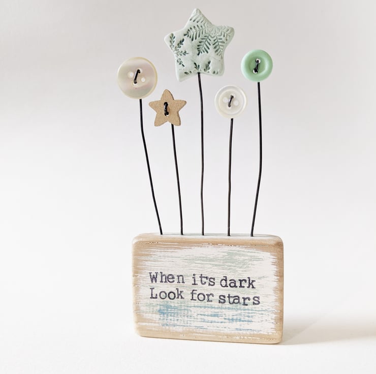 The little stamped words on the front say 'When it's dark Look for stars'.