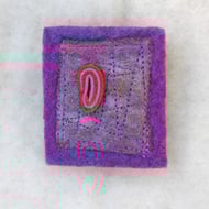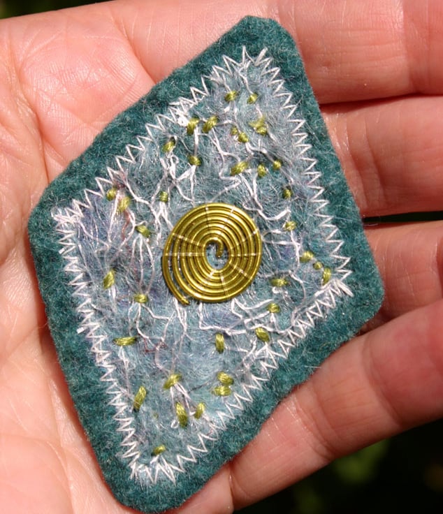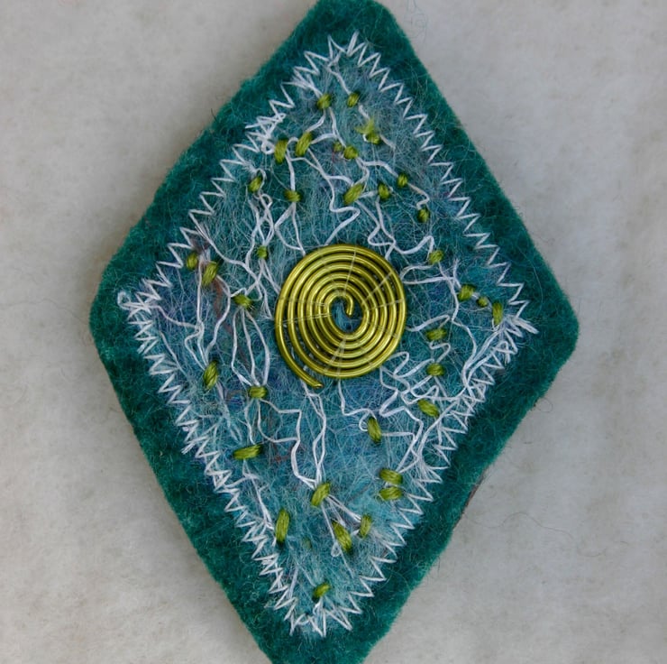 Diamond shaped hand made brooch. Felt and fabric brooch with textured machine stitching on the surface. I have also added some lime green embroidery stitches. With a sewn in lime green metal wire spiral. Backed with leather from offcuts. With a brooch back.