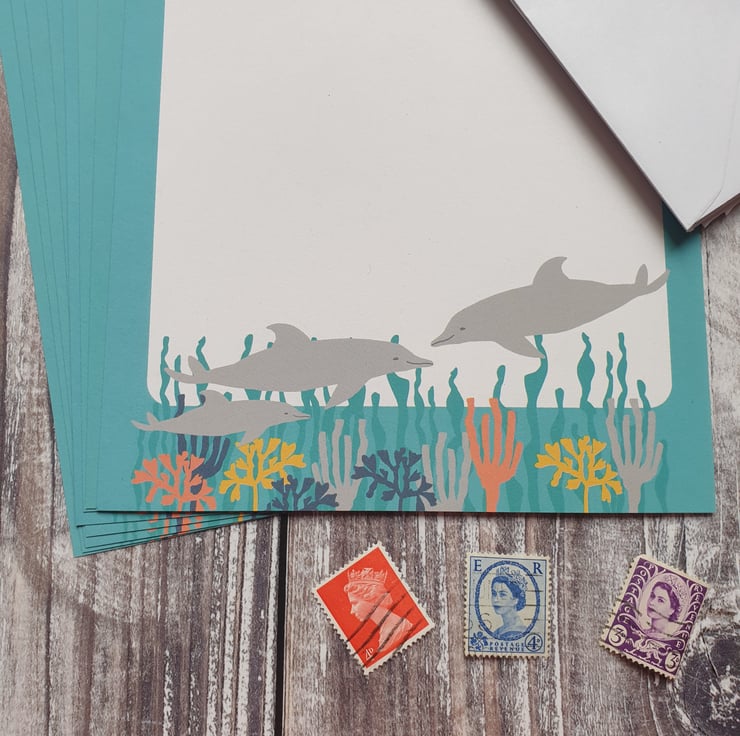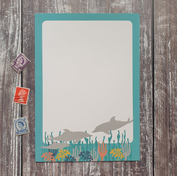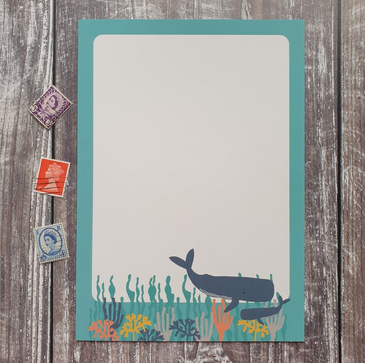 Whale and Dolphin A5 Writing Paper - A luxury A5 size writing paper set containing 8 sheets of luxury 100% recycled paper with a wonderfully thick 160gsm paperweight. There are 4 sheets with a dolphin design and 4 sheets with a whale design.