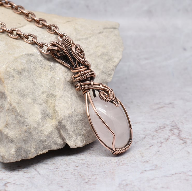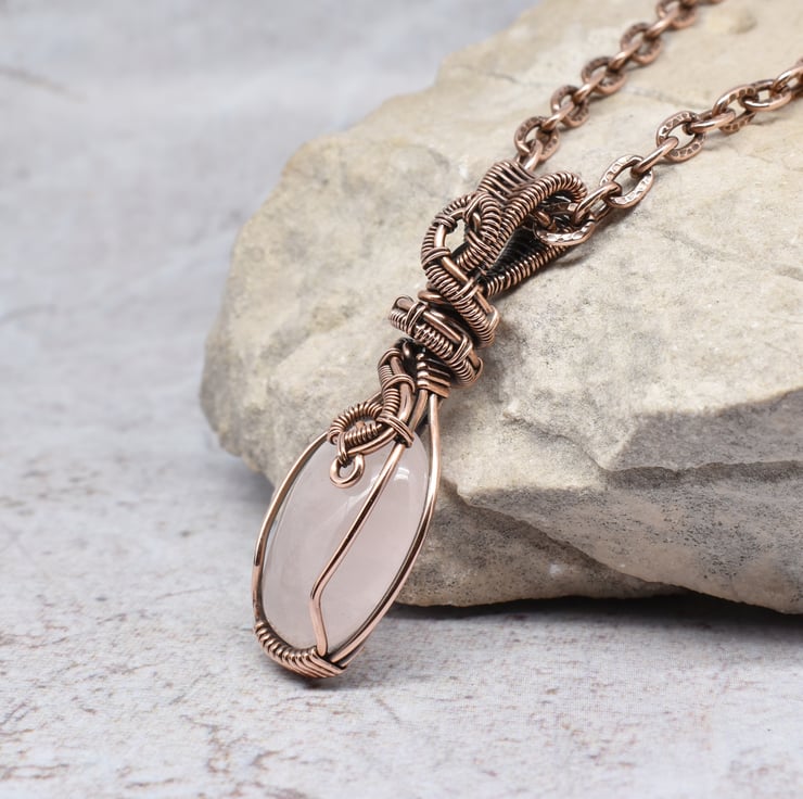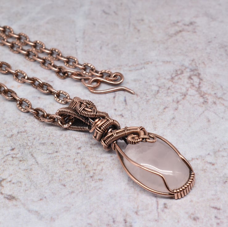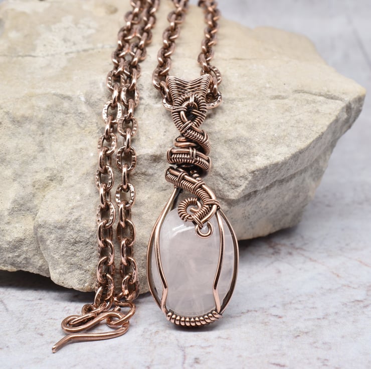 A pretty rose quartz I have wire wrapped and woven in solid copper wire to make this pink crystal pendant which hangs from a copper chain with a handmade clasp.