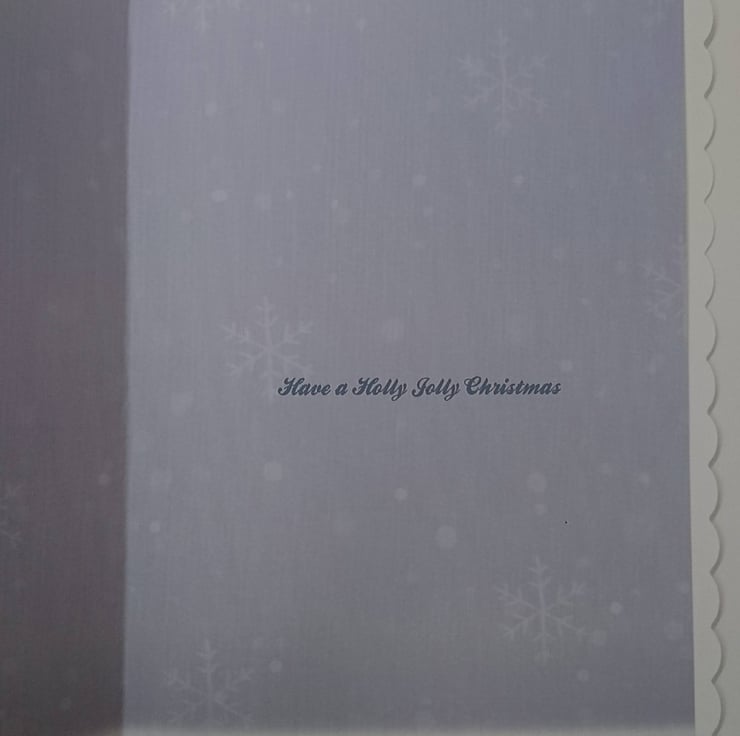 The inside of the card has a double full colour insert which matches the design on the front of the card. It has a printed sentiment that says: "Have a Holly Jolly Christmas" and there is plenty of room to write your own special message.