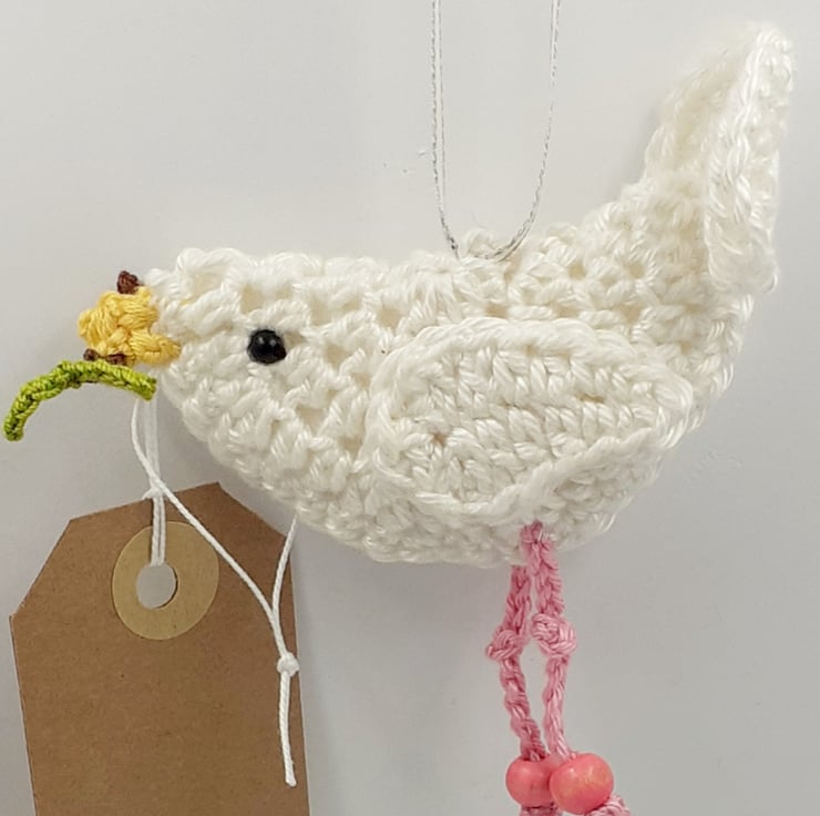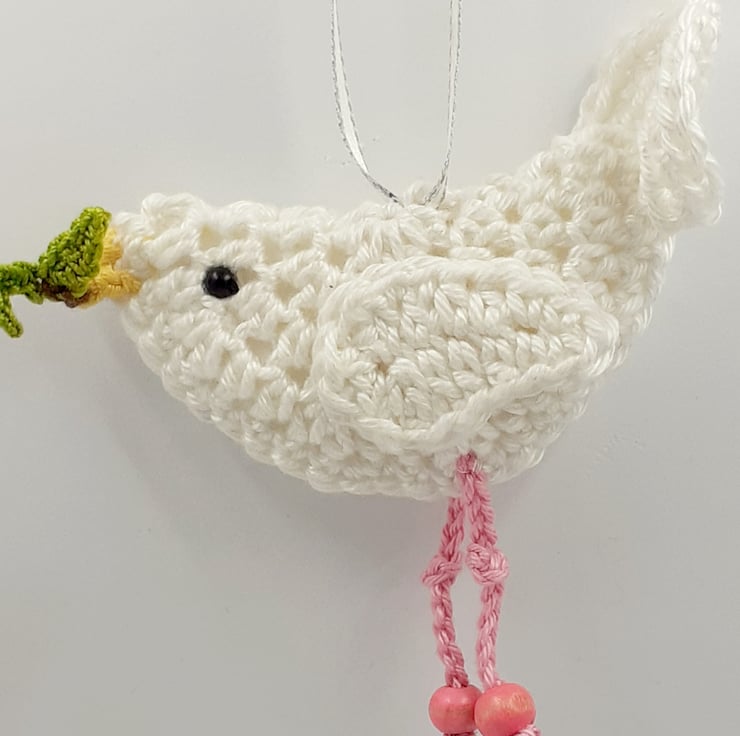 This demure dove is all ready to carry a Christmas message on your behalf. She would make a novel alternative to a greetings card this year and a pretty tree decoration for many years to come. She is a two dimensional decoration crocheted in cotton and lined with felt. She has dangly legs with knotty knees and beads for feet and eyes. She is carrying a tiny crocheted olive branch in her beak and a tag that reads Peace on Earth . Please note that I am very happy to exchange this tag for one with a message of your choice.